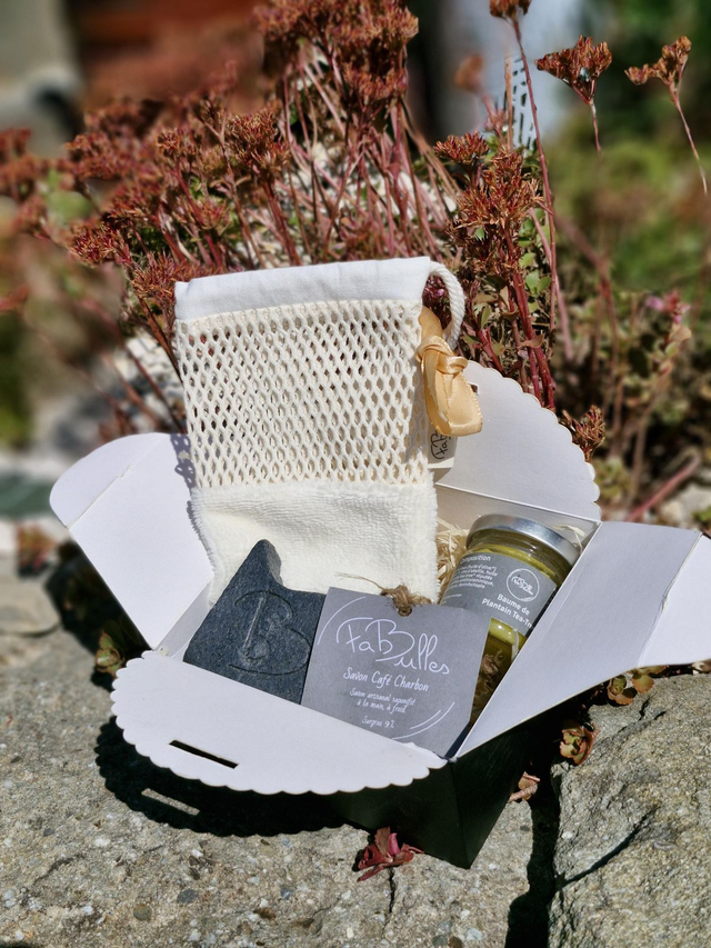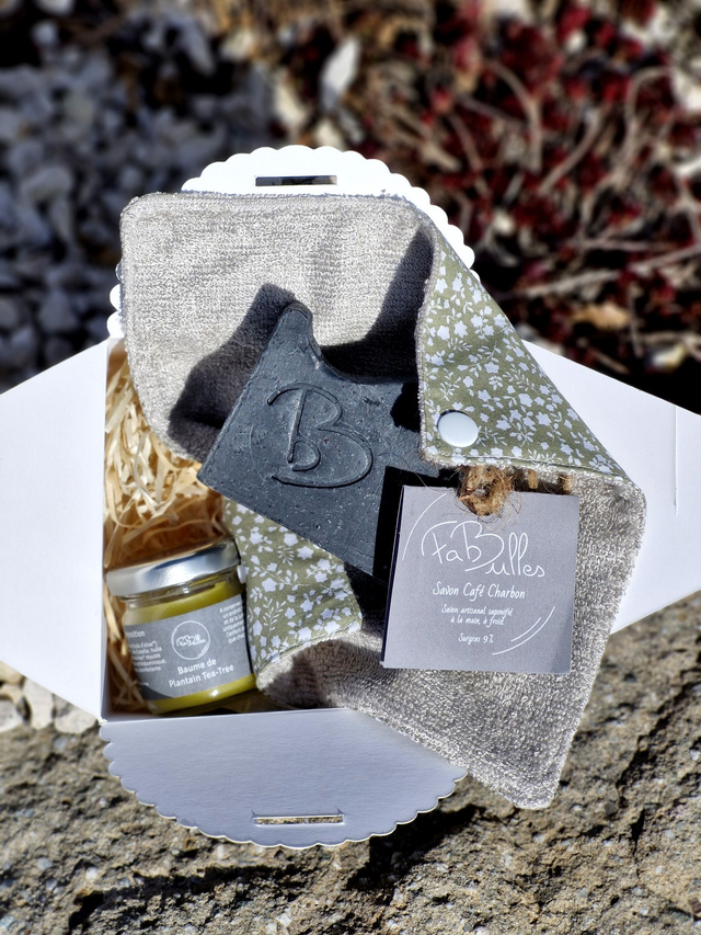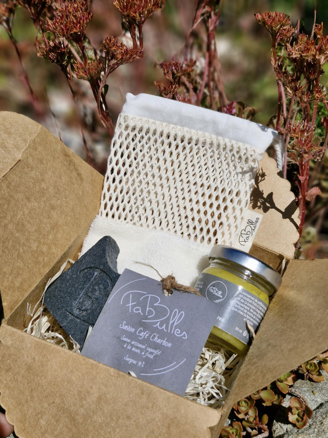 Choisissez la couleur de votre coffret noir ou kraft ainsi que la forme du savon rond (60g) ou carré (100g).